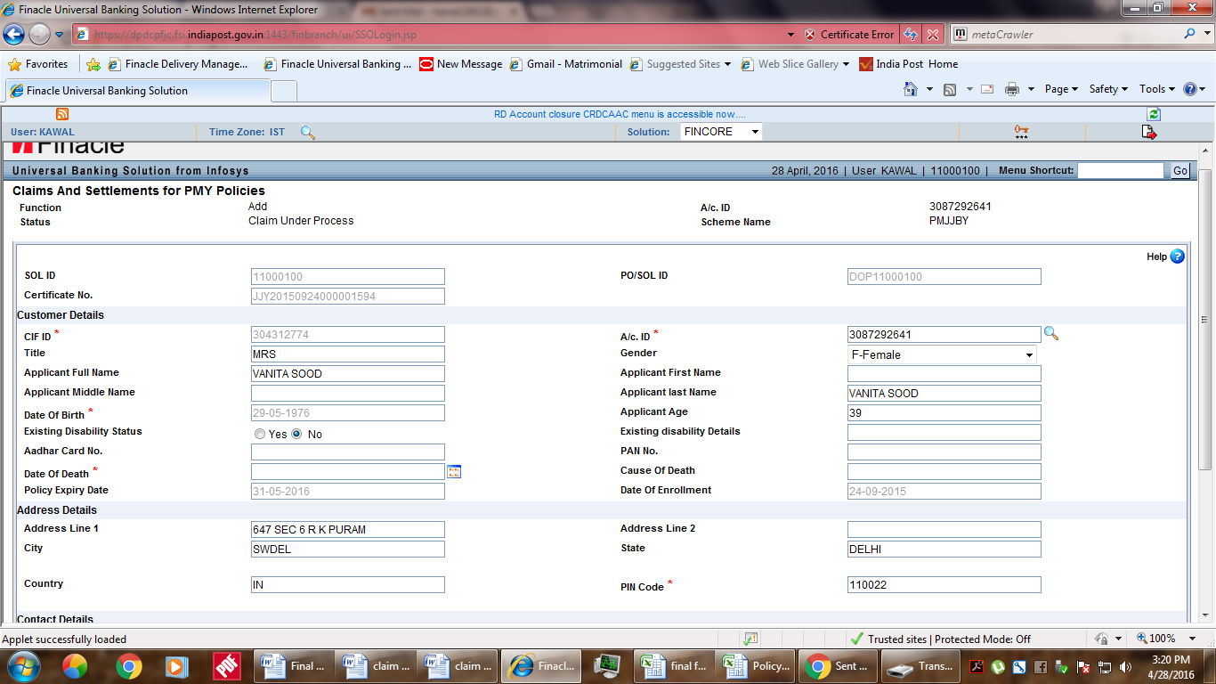 4. Post Office user will enter relevant details in Finacle menu CCSPMY